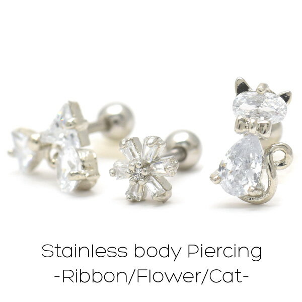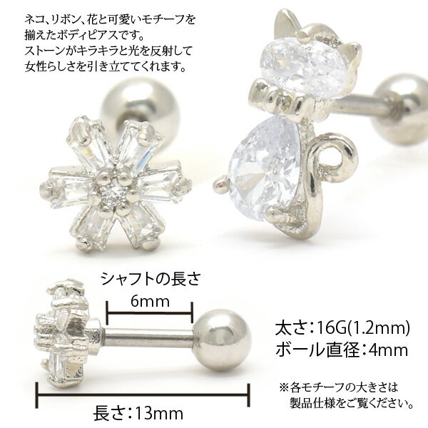 【 ステンレスボディピアス リボン 花 ネコ 】 シンプル 小ぶり 一粒ストーン フラワー お花 ねこ 動物 キャット 複数付け 小さい 耳 おへそ ピアス サージカルステンレス ストーン 透明ストーン クリアストーン キラキラ かわいい キャッチ付き おしゃれ ラインストーン