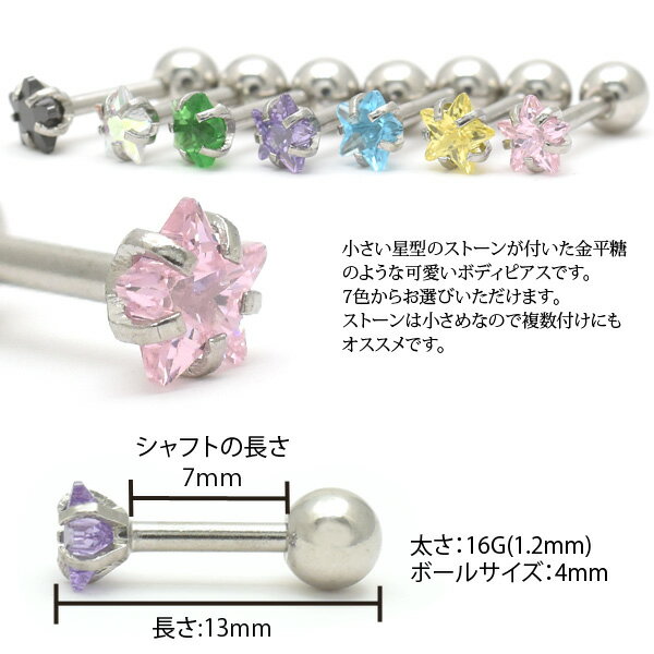 【ステンレスボディピアス】【1個売り】-カラフルスター-(ストレート バーベル型 ヘソピアス ヘソピ ボディピ フェス 夏 ファッション かわいい キレイ シンプル アクセント 水色 桃 黄 白 緑 黒)[M便 1/50]