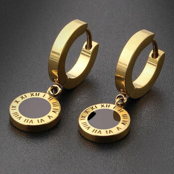 イエローゴールドメッキしたサージカルステンレス316L製のリングピアスにローマ数字をデザインしたペンダントチャームが揺れる高級ブランドのようなステンレスピアス。
